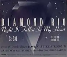 "Night Is Fallin' in My Heart" is a song written by Dennis Linde. The song was first recorded by country music artist J.P. Pennington for his 1991 album, Whatever It Takes. It was later recorded and released as a single in October 1994 by American country music group Diamond Rio. It was the second single released from their third album, Love a Little Stronger. It peaked at No. 9 in the United States, and No. 6 in Canada.