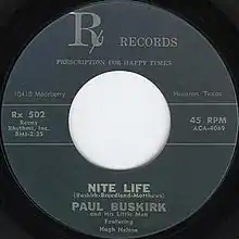 The song was rejected by Pappy Daily, who did not consider it country. Nelson, who owed Daily the recording of other songs, had sold "Night Life" for enough money to master the record at another studio. Daily threatened to sue Nelson if he pressed the song.[3] Nelson and Buskirk took the tapes from Gold Star Studios, and went to Bill Holford's ACA Studios to master the recording.[5] The song was recorded as "Nite Life," and credited to "Paul Buskirk and the Little Men featuring Hugh Nelson."[3] Released through Rx Records, few copies of the single were pressed,[5] and it received limited airplay by DJ Uncle Hank Craig on XEG.[6]