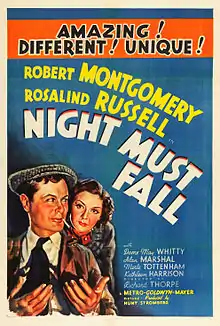 Night Must Fall is a 1937 American film adaptation of the 1935 play by Emlyn Williams, adapted by John Van Druten and directed by Richard Thorpe. It stars Robert Montgomery, Rosalind Russell and Dame May Whitty in her Hollywood film debut at age 72, who earned an Academy Award nomination for Best Supporting Actress. She reprised her role in the stage drama in London and New York City. A critical success, Night Must Fall was named the best film of the year by the National Board of Review. Robert Montgomery also received an Oscar nomination for Best Actor in a Leading Role. A 1964 remake starred Albert Finney, although the remake did not do as well as the original.