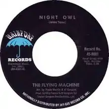 "Night Owl" was inspired by the Night Owl Cafe in Greenwich Village in New York City, where the Flying Machine often performed.[2][3] The Flying Machine version was released as a single backed by "Brighten Your Night with My Day."[4][5] Taylor and the other group members were dissatisfied with their performance on the recording, considering it "mediocre."[5] Although it got some regional radio play in the northeast United States, the label declined to fund further recordings by the band.[4] Author Stephen Davis described the song as "a rollicking R&B number."[2] Tony Orlando claims to have been particularly struck by the song.[6] Taylor later rerecorded "Night Owl," along with several other songs he wrote for the Flying Machine, such as "Knocking 'Round the Zoo," for his self-titled solo debut album on Apple Records.[5] Allmusic critic Lindsay Planer rated it as one of the "notable inclusions" on the James Taylor album.[7] The James Taylor album included instrumental interludes between songs, and James Taylor biographer Timothy White describes the brass instruments that were used for the interlude introducing "Night Owl" as "ungainly" and sounding like the overture to a Broadway musical.[4] White does feel that the brass instruments were used better accompanying the song itself.[4]