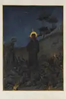 In the still of the night, the only source of light radiates in Annunciation to the Shepherds comes from an angel who has come to tell the shepherds of the birth of the infant Christ. The light is so brilliant that the Bethlehem shepherds must shield their eyes. Aside from the startling angel, the nocturnal painting is a pleasant, still pastoral scene with a group of angels in the distance.[14]
