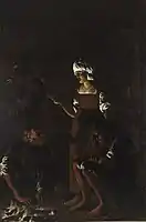 Georges de La Tour was a French Baroque painter who painted mostly religious chiaroscuro scenes lit by candlelight, which were more developed than his artistic predecessors, yet lacked dramatic effects of Caravaggio. He created some of the most arresting works in this genre, portraying a wide range of scenes by candlelight from card games to New Testament narratives.[20]