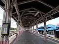 The station has one island platform, connected to the station building by an underground passage. This station has a zig zag.