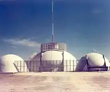 Since MAR was central to the entire Nike-X system, it had to survive attacks directed at the radar itself. At the time, the response of hardened buildings to nuclear shock was not well understood, and the MAR-I building was extremely strong. It consisted of a large central hemispherical dome of 10 foot (3.0 m) thick reinforced concrete[88] with similar but smaller domes arranged on the corners of a square bounding the central dome. The central dome held the receiver arrays, and the smaller domes the transmitters. The concept was designed to allow a transmitter and receiver to be built into any of the faces to provide wide coverage around the radar site.[89] As a test site, MAR-I only installed the equipment on the northwest facing side, although provisions were made for a second set on the northeast side that was never used. A tall clutter fence surrounded the building, preventing reflections from nearby mountains.[86]