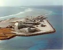 Construction of the launch site on Meck began in late 1967. In this installation, the majority of the system was built above ground in a single-floor rectangular building. The MSR was built in a boxy extension on the northwestern corner of the roof, with two sides angled back to form a half-pyramid shape where the antennas were mounted. Small clutter fences were built to the north and northwest, and the western side faced out over the water which was only a few tens of meters from the building.[106] Illeginni did not have a radar site; it was operated remotely from Meck.[107]