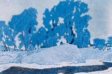 Colourful range of his works in 1960 become extremely broad, its coloring a ringing and decorative, but not local, and subtly linked to relief, with the expressive possibilities of the canvas surface, texture, smear. In this period the spectacular talent of Nikolai Timkov fully disclosed in all kinds of creativity – from large landscape painting to nature studies of small forms.[18] Among them paintings A First Snow[19] (1961), On the Tesa River,[20] Street in Kholuy,[21] Autumn Cherry trees (all 1962), February azure[22] (1963 ), In the March[23] (1965), A Spring, Autumn Gold, Volkhov River. A Last Snow[24] (all 1967), Sunny Day, Winter has come,[25] ″Torzhok″ (all 1968), "Russian Winter. A Hoarfrost."[26] (1969), April, Mstino Lake[27] (1971), June Blue,[28] A May. Bird cherry blossoms[29] (both 1972), In the Snow (1973), Danilov Monastery in the Pereslavl-Zaleski ancient town (1974), A Field under snow, A February[30] (both 1975), and others.