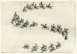 He made a series of 13 engravings of cavalcades or equestrian ballets, which were later remade by Jan van Ossenbeeck. The prints of cavalcades by Nicolaus van Hoy were published in Francesco Sbarra's 'La Contessa dell' Aria e dell' Aqua festa a cavallo rappresentata nell' augustissime nozze dell M.M. dell'Imperatore Leopold e dell' Infante Margherita della Spagne' in 1667.[6]