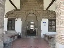 The Imaret is built in single courses of stone alternating with four courses of bricks, its vaults and domes covered with ceramic tiles.[1] The building is preceded by an open ended porch of five bays, with five arches in front and two on either side, carried by a succession of alternating piers and columns.[1] The central bay is surmounted by a small dome, while the four side bays are covered with flat topped cross vaults. Inside, the main hall is a square surmounted by a lofty dome carried on the belt of Turkish triangles.[1] On either side there are two large rooms with much lover domes; these have large ocaklar, or hearths, and were used as both kitchens and dormitories.[1] In front of the main hall is another hall of similar size divided into two sections by a great arch; this served as a mescit, as evidenced by the mihrab niche in the south wall.[1]