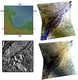 ![]() Nili Fossae as seen by CRISM. Top left: location of observation. Bottom left: context of observation. Top right: yellow-brown areas denote olivine, bright green areas denote phyllosilicates and purple areas pyroxene. Bottom right: approximate true-color view of the target area. | |