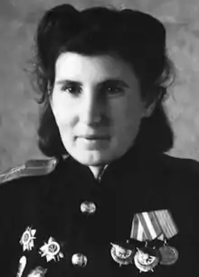 Nina Maksimovna Raspopova (Russian: Нина Максимовна Распопова; 31 December [O.S. 18 December] 1913 – 2 July 2009) was a pilot and flight commander in the 46th Taman Guards Night Bomber Aviation Regiment during World War II. Among many close calls with death, she twice survived being shot down in a Po-2 biplane. For her actions in the war she was awarded the title Hero of the Soviet Union on 15 May 1946.