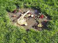 Pagan rituals at the site have involved chanting, singing, dancing, as well as the pouring of libations. Pagans also sometimes leave material traces, such as tea lights, flowers, or coins, around the monument.[57] Material found buried in the circle in modern times has included crystals, polished pebbles, a plastic comb, and a cigarette packet.[58] Human ashes have also been scattered at the Nine Ladies.[55] An oak tree near to the circle has been used as a rag tree, with visitors affixing rags, ribbons, and a range of other material to it;[59] they have also etched carvings into a natural rocky outcrop nearby.[60] Much of this activity contributed to the erosion of the ground at the site, especially where fires had been lit within the circle – sometimes close to the orthostats themselves,[61] although mainly in the centre, where a hollow had formed through the repeated lighting of fires.[62] In many cases, visitors touched and sat on the stones, contributing to their erosion.[62] At the summer solstice in 1990, revels at the site led to the King Stone being broken off at ground level; it was propped up by additional stones before being repaired in 2000.[62]