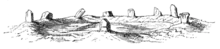 Late 18th century records suggest the presence of a feature in the centre of the circle. In his 1780 sketch of the site, the antiquarian Hayman Rooke depicted what looks like a hollow in the middle of the ring; this was then exaggerated in a watercolour painting based on his initial sketch. However, in 1782 he wrote that there was a stone in the centre, which he depicted in an illustration of the Nine Ladies drawn in 1793. These competing claims make it difficult to determine what really existed in the middle of the ring in the late 18th century; it is possible that Rooke imagined that a stone had once stood in the hollow and thus claimed that it still did.[31] An alternative possibility is that there was once a stone in the centre and that it was moved, being the stone discovered in 1977.[31] In the 19th and early 20th century, some commentators believed there was evidence for an earthen mound inside the circle, something which was then included in illustrations of the monument, although other observers simply stated that the ground here was uneven.[32] By the early 21st century, any evidence of an internal mound that had existed was gone.[33] It is possible that this loss was partly caused by people digging into it.[19] Based on allegations of a mound, Burl suggested that within the circle had once stood a tumulus in which human remains had been buried.[3]