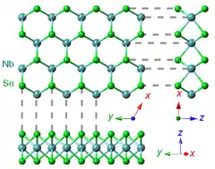 Niobium diselenide or niobium(IV) selenide is a layered transition metal dichalcogenide with formula NbSe2. Niobium diselenide is a lubricant, and a superconductor at temperatures below 7.2 K that exhibit a charge density wave (CDW). NbSe2 crystallizes in several related forms, and can be mechanically exfoliated into monatomic layers, similar to other transition metal dichalcogenide monolayers. Monolayer NbSe2 exhibits very different properties from the bulk material, such as of Ising superconductivity, quantum metallic state, and strong enhancement of the CDW.[3]