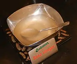 Nipa palm vinegar, also known as sukang sasâ or sukang nipa, is a traditional Filipino vinegar made from the sap of the nipa palm (Nypa fruticans). It is one of the four main types of vinegars in the Philippines, along with coconut vinegar, cane vinegar, and kaong palm vinegar.[1] It is usually sold under the generic label of "palm vinegar".[2]