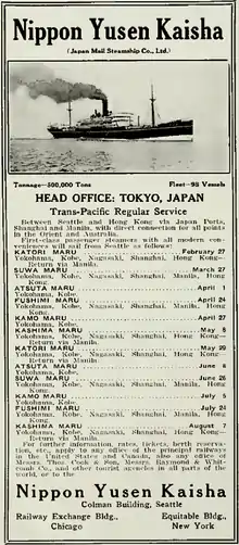 The company's Katori Maru was used by Chinese Muslims to travel to Singapore on their way to Makkah for the hajj in 1925. From there, the company had the pilgrims travel on board other Japanese steamships to Suez and then to Makkah. The company promised to take responsibility for all the necessary formalities and helped contact other local transportation agencies that could take the pilgrims to Makkah. Chinese pilgrims were promised a 20% discount for their tickets. A third-class ticket that sold for £5/10/0 would be £4/8/0, while a second-class ticket sold for £14/0/0 would be sold for £11/5/0.[7]