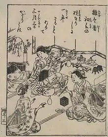 Nishikawa Sukenobu (西川 祐信, 1671 – August 20, 1750), often called simply "Sukenobu", was a Japanese printmaker from Kyoto. He was unusual for an ukiyo-e artist, as he was based in the imperial capital of Kyoto. He did prints of actors, but gained note for his works concerning women. His Hyakunin joro shinasadame (Appreciating 100 women), in two volumes published in 1723, depicted women of all classes, from the empress to prostitutes, and received favorable results.