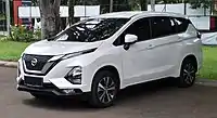 The second-generation Livina was launched in Indonesia on February 19, 2019, a month after Nissan ceased the production of the L11 Grand Livina.[19][20] A byproduct of Renault–Nissan–Mitsubishi Alliance,[21][22][23] it is a rebadged and redesigned variant of the Mitsubishi Xpander and manufactured alongside it by Mitsubishi Motors plant in Cikarang, West Java. Nissan decided to use the "Livina" name in this model due to the established nameplate usage in the country.[24] As it is based on the Xpander, it is offered in one body variant only and has some crossover SUV-like proportions compared to previous generation's low slung station wagon-like proportions.[25] Compared to the Xpander, Nissan has redesigned several body panels including the Nissan's V-Motion grille, headlights, front bumper, front fenders, front side doors, rear bumper, rear tailgate metal sheet casing and taillight internals.