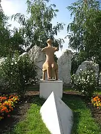 A famous find was a neolithic figurine of a sitting woman, which was dubbed Hrádocká Venuša, or the Venus of Hradok. "Venus" is an umbrella term used in archaeology for objects of this type. The figurine was depicted on Slovakia's two-koruna coin. In 1997 a statue by Jaroslav Gubric was erected at Hradok, an enlarged copy of the figurine.[2][3]