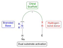 Building on the work of Jacobsen, it was recognised that H-bond donor motifs can be linked via a chiral scaffold to Brønsted basic moieties, creating a new class of bifunctional organocatalysts (see concept figure below). The incorporation of these two functionalities allows the simultaneous activation of the nucleophile (via deprotonation by the Brønsted base) and electrophile (via H-bond donation), thus allowing the development of novel enantioselective reactions through new activation modes.