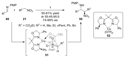 Building on the work of Shibasaki, Jørgensen and co-workers reported the asymmetric nitro-Mannich reaction of nitroalkanes and a N-PMP-α-iminoesters.[21] Catalysed by Cu(II)-BOX 52 and triethylamine (Et3N), the reaction afforded β-nitro-α-aminoesters in good yields with excellent enantiocontrol (up to 99% ee). The reaction tolerates a selection of nitroalkanes but is limited exclusively to N-PMP-α-iminoesters. The authors propose that the reaction proceeds via the chair-like transition structure, where both the N-PMP-α-iminoester and the nitronate anion bind to the Cu(II)-BOX complex.