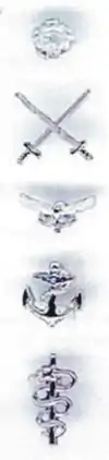 Award of the decoration for service in active military operations is indicated by distinguishing insignia, which indicate the arm of the service in which the recipient was serving at the time of the action for which the decoration was conferred. The insignia are struck in silver and is worn on the ribbon, above any bars which may have been awarded.