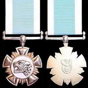 The Nkwe ya Selefera - Silver Leopard, post-nominal letters NS, was instituted by the President of South Africa on 16 April 2003 and came into effect on 27 April 2003. The bilingual title of the decoration is in Sesotho and English. This decoration replaced the Honoris Crux (HC) as South Africa's second highest military decoration for bravery. It is the middle award of a set of three military decorations for bravery, along with the Nkwe ya Gauta - Golden Leopard and the Nkwe ya Boronse - Bronze Leopard.[1][2][3]