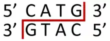 NlaIII recognizes the palindromic and complementary DNA sequence of CATG/GTAC and cuts outside of the G-C base pairs. This cutting pattern results in sticky ends with GTAC overhangs at the 3' end.[4]