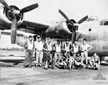 No. 23 Squadron returned to operational status as a heavy bomber squadron in October 1944 after being re-equipped with B-24 Liberator bombers.[10] As part of No. 82 Wing RAAF,[11] the squadron deployed to Long Airfield in the Northern Territory in April 1945 and conducted bombing and anti-shipping missions over the Netherlands East Indies until the end of the war.[1] Following the Japanese surrender the squadron's B-24s were based at Balikpapan in Borneo and operated in the transport role, flying ex-Prisoners of War and other Australian personnel back to Australia.[7] No. 23 Squadron returned to Australia in November 1945 and was based at RAAF Station Tocumwal until early 1948 when it moved to RAAF Base Amberley and was redesignated No. 6 Squadron.[1][12] A total of 36 personnel from No. 23 Squadron were killed during the war.[1]
