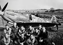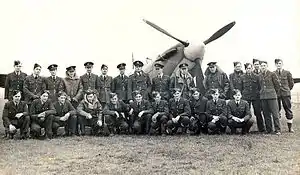 No. 485 (NZ) Squadron was the first of the New Zealand Article XV squadrons, formed on 1 March 1941 at RAF Driffield, in Yorkshire. Its first commander was Squadron Leader Marcus Knight, an experienced pilot from Dannevirke who had joined the RAF in 1935 and flown Hawker Hurricanes with No. 257 Squadron prior to being appointed commander of No. 485 Squadron. The two flight commanders were likewise experienced pilots, and among the other personnel were Pilot Officers Edwards Wells and Bill Crawford-Compton.[4] While the majority of the pilots that flew with the squadron during the war were New Zealanders, at times its flying personnel included Britons, Canadians and Australians, and even briefly, an American of the United States Army Air Force. There were some ground crew from New Zealand as well, although the majority were British.[5][6]