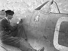 On 22 August the squadron suffered its worst day; during a high cover escort mission for B-26 Marauders, over 50 German fighters attacked the Biggin Hill Wing. Four of the squadron's pilots were shot down with two enemy aircraft shot down in return. One of the pilots lost was Jack Rae, who had destroyed at least eleven enemy aircraft by that stage of the war; he became a prisoner of war.[52] Checketts was shot down the next month but despite receiving burns to his hands and face, he was able to link up with the French Resistance.[53] With their help he, and another pilot of the squadron who had also been shot down and avoided capture, was able to return to England via a fishing boat in October.[54][55]