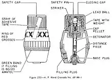 Using the No. 69 bomb was very simple: the screw-off cap was removed and discarded, and the grenade was then thrown. When the grenade was thrown, a linen tape with a curved lead weight on the end automatically unwrapped in flight, freeing a ball-bearing inside the fuze. In this manner the "all ways" action impact fuze was armed in flight and the grenade exploded on impact;[1] and like the Gammon grenade, which used the same fuze design, it was withdrawn from service soon after the Second World War ended.