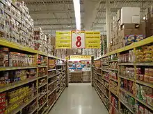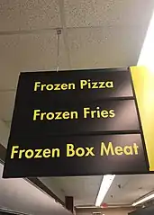 In order to reduce costs as much as possible, No Frills customers had to forego some of the conveniences that North American supermarket shoppers had come to expect. Customers were required to pack their own groceries and bring their own shopping bags or pay three cents for each.[8] The prototype store had only four checkout counters and operated on a "low labour" principle of minimal staffing.[9] Product displays were purely functional with items left in their cardboard boxes with the front cut away. Produce, normally washed and stacked, was left unwashed in its shipping carton. The original store did not offer fresh meat since refrigeration units had been removed to reduce expenses. Instead of the 8,000 items normally carried by the average supermarket, only 500 were available, usually represented by one brand and in only one size. Instead of each item individually marked, prices were displayed overhead and customers were provided with a price list. Cashiers underwent three weeks of training and were required to memorize all prices in the store. Loblaws president Dave Nichol promoted the minimalism of the new operations as a way to save money in a difficult economy. "We took all the frills out."[9]