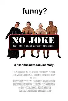 No Joke is about three Canadian stand-up comedians who are "rejected as hopelessly unfunny by hometown audiences and thus flee to America for a whirlwind comedy tour (accompanied by intentionally 'unfunny' test subject, Vibrato 3.72 'The Human Vibrator') to determine once and for all whether they have any star potential. Their penultimate comedic judgement comes via private audition for Jamie Masada, owner of the World Famous Laugh Factory in Hollywood, California. The results are hilarious, heartbreaking, and completely unexpected." The film is directed by Matt Frame and is the follow-up to the 2004 film Baghdad or Bust.[3]