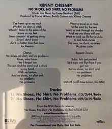"No Shoes, No Shirt, No Problems" is a song written by Casey Beathard and recorded by American country music singer Kenny Chesney. It was released in May 2003 as the fifth and final single from his album of the same name. The song peaked at number 2 on the Billboard Hot Country Singles & Tracks chart in August 2003, behind Alan Jackson and Jimmy Buffett's "It's Five O'Clock Somewhere".[1]