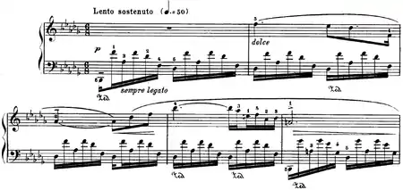The opening alternates between major and minor and uses wide arpeggios, commonly found in other nocturnes as well, in the left hand; such arpeggios require a wide left hand to play smoothly. James Huneker commented that the piece is "a masterpiece",[5] pointing to the "morbid, persistent melody" of the left hand.[5] The più mosso uses mostly triplets in the left-hand and modulates to A♭ major in measure 49. It ends with a cadenza before transitioning back to the primary theme. For David Dubal, the più mosso has a "restless, vehement power".[6] Huneker also likens the più mosso to a work by Beethoven due to the agitated nature of this section.[5] The coda "reminds the listener of Chopin's seemingly inexhaustible prodigality" according to Dubal[6] while Huneker calls it a "surprising climax followed by sunshine" before returning to the opening theme.[5]