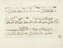Blair Johnston calls the main cadence, near the end of the piece, "one of the most glorious moments in Chopin's entire output".[4] Johnston also calls the piece "one of [Chopin's] most graceful essays in fioritura ornamental practices".[4] Huneker states that the piece "really contains but one subject, and is a song of the sweet summer of two souls, for there is obviously meaning in the duality of voices."[7] The piece contains a harmony of broken chords which is played with the left hand, a habit Chopin had when composing his nocturnes,[8] while the right hand plays the main melody, often with the addition of a second voice. Various sections consisting of grace notes and polyrhythms add to the delicate and somewhat melancholic mood that the piece conveys.