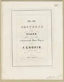 The Nocturnes, Op. 48 are a set of two nocturnes for solo piano written by Frédéric Chopin in 1841[1] and published the following year in 1842. They are dedicated to Mlle. Laure Duperré. Chopin later sold the copyright for the nocturnes for 2,000 francs along with several other pieces.[2]