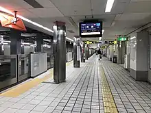 - Ticket gates are located in the center east and the center west: the former connects to Platform 1 for entrance and exit by stairs and an elevator, and the latter connect from Platform 2 for exit by stairs only. The north gate and the south gate were closed and the center west gate became in use on March 27, 2020.[1]
