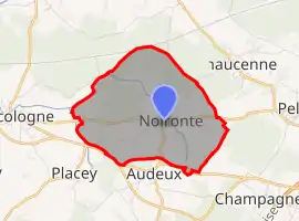 The commune of Noironte is located in the Bourgogne-Franche-Comté region and in the north-western extremity of the departement of Doubs. It lies 11.5 km (7.1 mi) west of Besançon, prefecture of the department and 64 km (40 mi) east of Dijon, the capital of the region. The shortest distance by road between the village center and the city center of Besançon (Place du Huit-Septembre) is 14 km (8.7 mi). It is at the limit of the lower valley of the Ognon River and the Jura Mountains area of Avants-Monts. It is part of the canton of Besançon-2 and Grand Besançon Métropole. It is also integrated in the urban area of Besançon. The municipal territory is bordered by nine other municipalities.