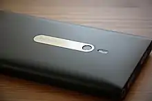 Lumia 800 shares its design with the previously released MeeGo-based Nokia N9 and it was originally Meego CDMA-variant for Verizon with codename RM-716 Searay.[11] The outward differences are one added physical button dedicated to the camera on the right side of the phone, and a dual LED flash moved directly above the Carl Zeiss camera lens.[12] Despite a similar exterior, the Lumia 800 has a different interior than N9. Lumia 800's chipset comes from Qualcomm, whereas the N9 is based on a Texas Instruments OMAP chipset and CPU.[13][14] Like the N9, it has a convex-curved Gorilla Glass AMOLED PenTile screen with a ClearBlack antiglare filter. The screen diagonal is 3.7 inches (800 x 480 pixels), compared with 3.9 inches (854 x 480 pixels) for N9, to conform with the Windows Phone specifications list, which includes three capacitive softkeys placed under the glass. A through-colored unibody shell is made from polycarbonate plastic.[1]