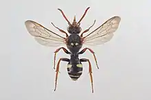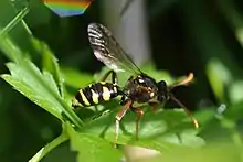 Nomada marshamella is most frequently a univoltine species, but where the host used is the bivoltine Andrena trimmerana, then N. marshamella will also be bivoltine.[3] The univoltine form is associated primarily with Andrena scotica, and sometimes A. nigroaenea, and it flies from early April to late June while the bivoltine form's normal host is A. trimmerana, and sometimes late nesting A. nigroaenae flying from late June into September.[4] N. marshamella is known to cleptoparasitise the nests of A. scotica and they have been recovered from such nests. It is also thought that N.marshamella may parasitise Andrena ferox, A. stragulata, A. trimmerana, A. nigroaenea and A. haemorrhoa, in the Czech Republic A. rosae has also been recorded as a host of N. marshamella.[4][1] A. trimmerana has only been recorded as a host of this species in England.[1]