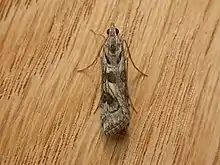 The wingspan is about 20 mm. Adults have wings with variable brown splotches.[1]