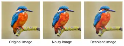 If compared with other well-known denoising techniques, non-local means adds "method noise" (i.e. error in the denoising process) which looks more like white noise, which is desirable because it is typically less disturbing in the denoised product.[2] Recently non-local means has been extended to other image processing applications such as deinterlacing,[3] view interpolation,[4] and depth maps regularization.[5]