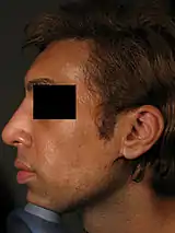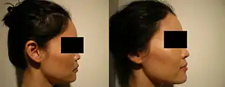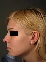 Non-surgical rhinoplasty is a medical aesthetic procedure in which injectable fillers, most commonly hyaluronic acid ones like Restylane and Juvederm or calcium hydroxyapatite (Radiesse), are used to alter and shape a person's nose without a surgery.[1][2] The procedure fills in depressed areas on the nose, lifting the angle of the tip or smoothing the appearance of bumps on the bridge.[3] Non surgical rhinoplasty is an augmentation procedure, so it cannot reduce the size of someone's nose. The cosmetic procedure carries the risk of causing serious skin damage or distant complications like blindness. If the filler product is injected into an artery, filler can travel in the arteries and blocks smaller size arteries like ophthalmic artery and cause blindness. If blood vessels of the skin is blocked, skin necrosis can develop. Hyaluronic acid based fillers can be reversed even if injected into a blood vessel with an enzyme called hyaluronidase, which can be also injected like fillers.