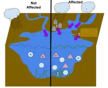 Nutrients mainly refers to inorganic matter from runoff, landfills, livestock operations and crop lands. The two primary nutrients of concern are phosphorus and nitrogen.[8]