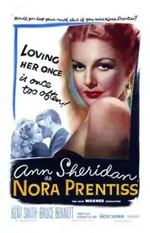 Nora Prentiss is a 1947 American film noir drama film directed by Vincent Sherman and starring Ann Sheridan, Kent Smith, Bruce Bennett, and Robert Alda.[3] It was produced and distributed by Warner Bros. The cinematography is by James Wong Howe and the music was composed by Franz Waxman. The film's sets were designed by the art director Anton Grot.