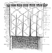 Noren (暖簾) are traditional Japanese fabric dividers hung between rooms, on walls, in doorways, or in windows. They usually have one or more vertical slits cut from the bottom to nearly the top of the fabric, allowing for easier passage or viewing. Noren are rectangular and come in many different materials, sizes, colours, and patterns.