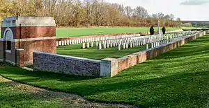 It contains the remains of 549 soldiers of the British Commonwealth, mainly those of the United Kingdom. Of the 326 identified casualties are 318 Britons, six Australians, a Canadian, and an Indian soldier.[1] Many of the soldiers buried in the cemetery were those of the 21st Division who were killed or died of wounds during the opening days of the Battle of the Somme.[2]