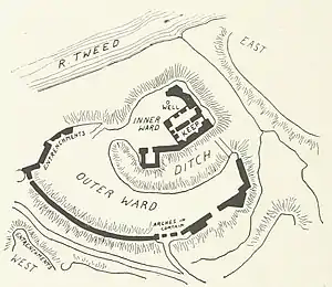 The castle stands on the south bank of the River Tweed, high above the river, so that the north side is protected by a steep slope. A deep ravine protected the east side and an artificial moat was dug round the west and south sides to complete the protection. The castle had an inner and outer ward. The inner ward stood on a mound and was separated from the outer ward by a moat, crossed by a drawbridge.