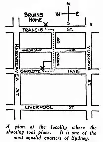 On Wednesday night, 22 June 1927, Norman Bruhn and three other men engaged a taxi-driver near Paddington Post-office. At their request the driver, Noel Infield, took them to Charlotte-lane in Darlinghurst, close to the south-east corner of Hyde Park, and was told to wait.[59] At about ten o'clock the four men entered Mack's, a house at 22 Hargrave-street (on the corner with Charlotte-lane) owned by Joe McNamara and his brother which they operated as a sly-grog shop.[60][61][52] Bruhn's companions were Robert Miller, a man named Hassett and another man. McNamara later gave evidence that he knew the third man as 'Snowy' (possibly 'Snowy' Cutmore).[62] After remaining on the premises for about fifteen minutes, Bruhn's group left Mack's.[60] On leaving the house Bruhn and his companions were approached by two men in Charlotte-lane. As they pushed past Miller, one of them said to him, "You get out of this, you’re not in it".[53] One of the men then drew a revolver and shot Bruhn multiple times at close range. Five shots were fired, of which three hit their target. Bruhn slumped to the laneway, two .32 calibre bullet wounds in his abdomen and another which grazed his chest in two places.[63] Constable Blench, who was walking along nearby Yurong-street, heard the five shots at about 10.30 p.m., fired in quick succession. He ran into Charlotte-lane and saw Bruhn lying in a pool of blood, with Miller bending over him. Blench also saw two men running from the scene.[64][65] Bruhn was put into Infield's taxi and taken to Sydney Hospital.[66] At the hospital Constable Blench later reported that Miller remarked to him, regarding Bruhn's shooting, "It’s the coldest thing I’ve seen".[62] When Bruhn was admitted to hospital, he was suffering severely from shock as a result of his wounds.[63]